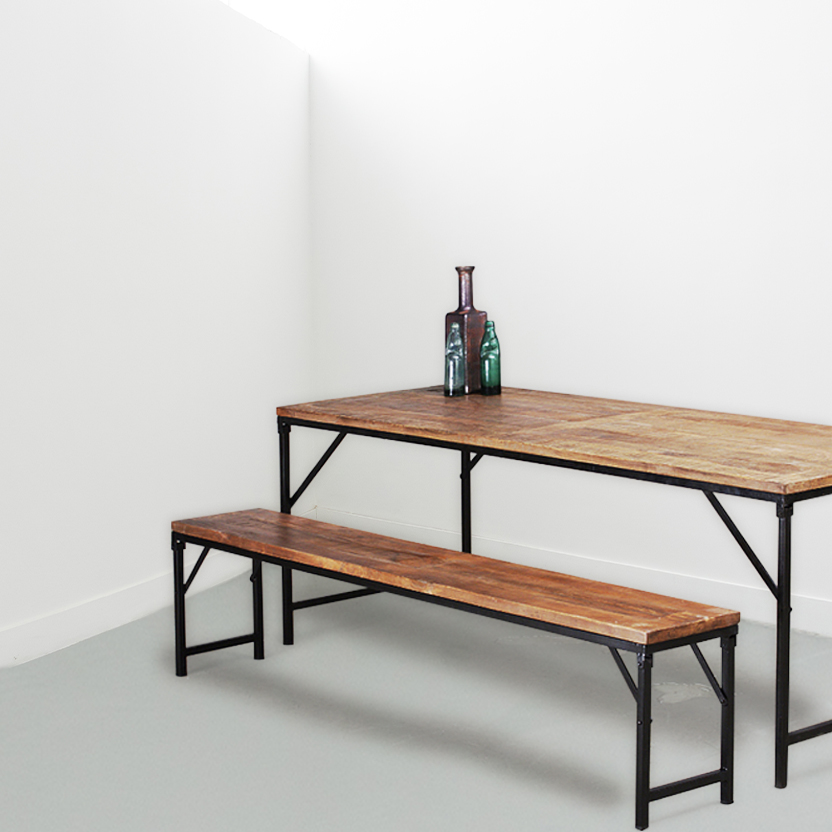 Large Brewhouse folding bench with a black steel frame and antique finish mango wood seat. Mango wood is a sustainable by-product of the fruit industry. Part of our vintage-style beer hall collection of bar and restaurant furniture range.