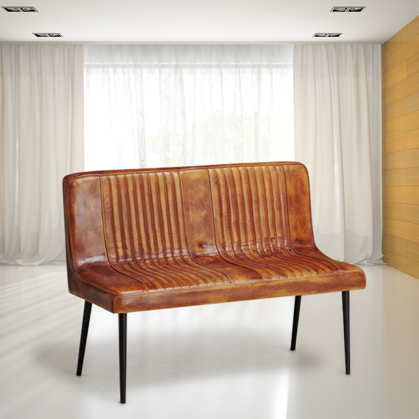 The Morris two seat bench is a vintage-style bench with stylish tapered steel legs and vintage ribbed leather upholstery.